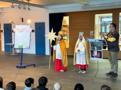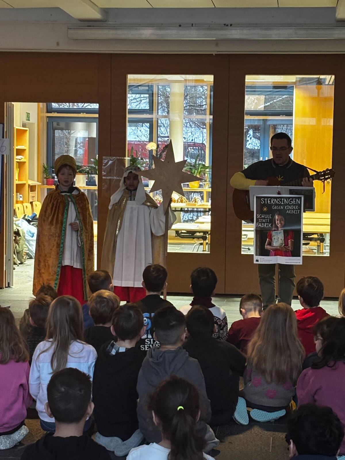 Am 8.1.2026 traten unsere beiden Sternsinger auf. Sie sangen und erklärten der Schule was sie an die Türen schreiben.