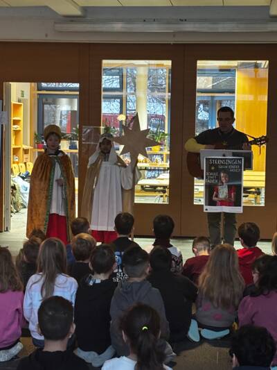 Am 8.1.2026 traten unsere beiden Sternsinger auf. Sie sangen und erklärten der Schule was sie an die Türen schreiben.